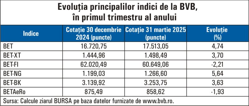 Indicii Bursei de Valori Bucureşti (BVB) au înregistrat creşteri uşoare, în primul trimestru al anului, într-un climat marcat de tensiunea geopolitică din Europa şi de incertitudinea politică din ţara noastră, unde urmează să aibă loc alegeri prezidenţiale în luna mai, elemente ce au pus în plan secund raportările companiilor aferente celui de-al patrulea trimestru al anului trecut şi, în unele cazuri, propunerile de dividende.