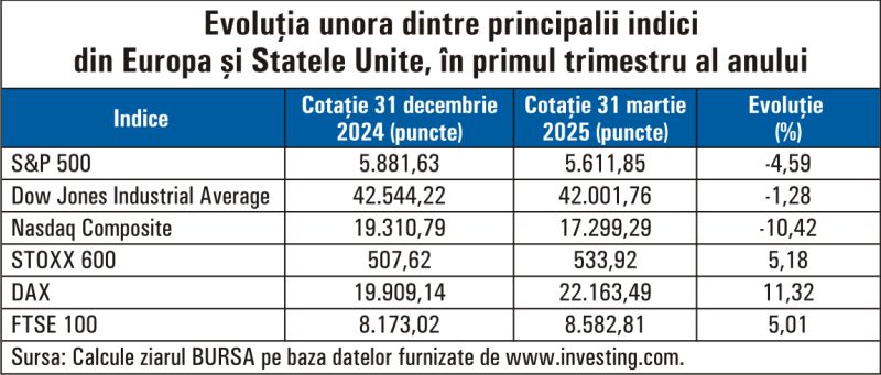 De partea noastră a Atlanticului pieţele de acţiuni au avut o evoluţie net superioară celor din Statelor Unite, datorată în primul rând perspectivelor unor investiţii masive în apărare şi infrastructură. Indicele pan-european Stoxx 600 a avut o creştere de 5,2%, în vreme ce la Londra, indicele FTSE100 s-a apreciat cu 5%. Indicele DAX de la Frankfurt a avut un avans de 11,3%, în vreme ce Banca Centrală Europeană a tăiat de două ori dobânda de referinţă.