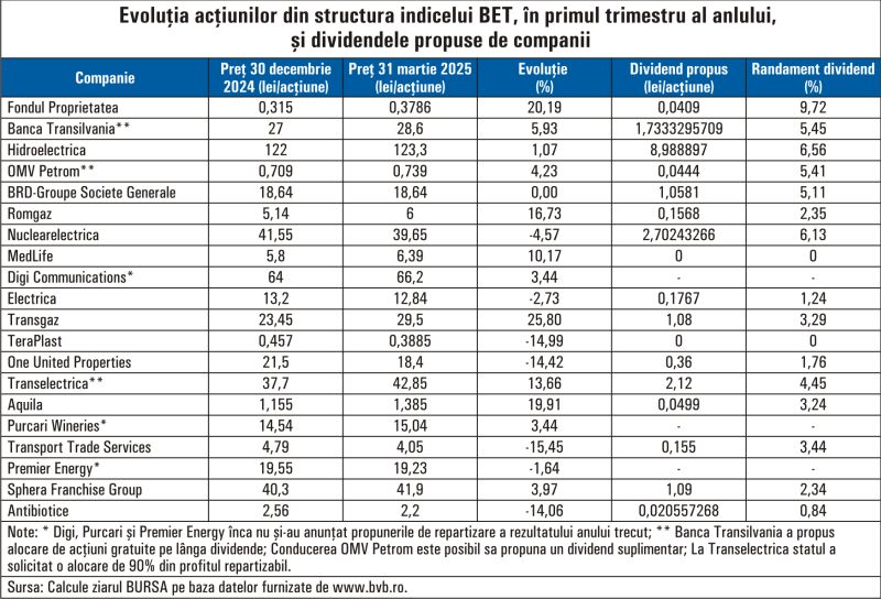 Titlurile transportatorului de energie electrică Transelectrica s-au apreciat cu 13,7%, în primul trimestru al anului, creşterea fiind înregistrată înainte publicării rezultatelor financiare excelente aferente ultimului trimestru al anului trecut, respectiv pentru întregul an 2024, compania ajungând la un nou maxim al profitului net anual. Conducerea emitentului a propus alocarea a jumătate din rezultatul repartizabil ca dividende, echivalentul unui randament de 4,4%, dar statul a solicitat o alocare de 90% din profit. Acţiunile Electrica s-au depreciat cu 2,7%, în primele trei luni ale anului curent, dividendul propus de conducerea furnizorului şi distribuitorului de energie având un randament de 1,2%.