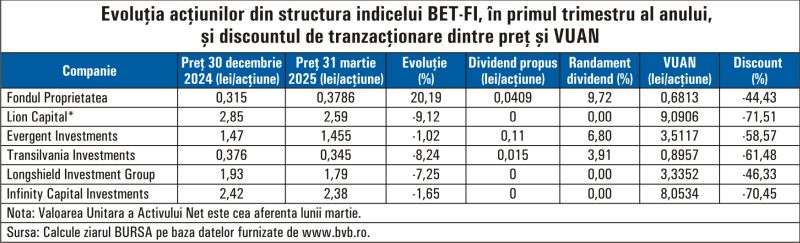 La finalul lunii martie, fostele SIF-uri se tranzacţionau la discount-uri între preţ şi Valoarea Unitară a Activului Net (VUAN) situate între 71% pentru Lion Capital şi 46% în cazul Longshield Investment. Pentru FP, discountul era de 44%, peste obiectivul administratorului Franklin Templeton, de sub 15%.