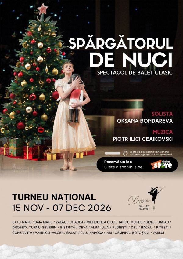 Atmosfera sărbătorilor de iarnă se va împleti cu eleganţa baletului clasic printr-un turneu al celebrului balet ”Spărgătorul de Nuci”, desfăşurat în perioada 15 noiembrie - 15 decembrie 2026, în mai multe oraşe din ţară. Spectacolele sunt susţinute de compania Classico Internazionale Napoli, iar invitată special este prim-balerina Oksana Bondareva, una dintre cele mai apreciate figuri ale baletului clasic internaţional, anunţă un comunicat de presă.