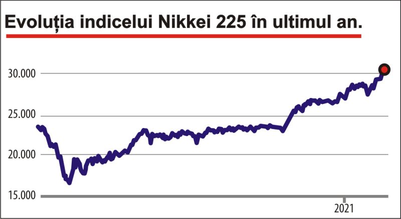 În cele două sesiuni de tranzacţionare din această săptămână, indicele a câştigat aproape 1.000 de puncte. Ieri, Nikkei 225 a încheiat ziua în urcare cu 1,3%, la 30.467,75 puncte.