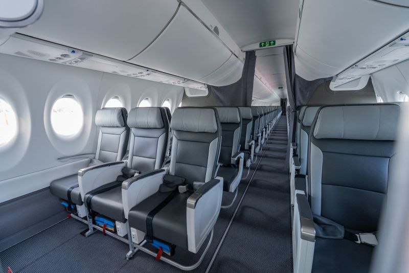 Modelul Airbus A220-300 este recunoscut la nivel internaţional pentru eficienţa operaţională şi confortul oferit pasagerilor. Configuraţia de 148 de locuri în clasa economy oferă mai mult spaţiu per pasager comparativ cu aeronave similare din aceeaşi categorie, contribuind la o experienţă de zbor mai confortabilă. Noua aeronavă are locuri dispuse în formatul specific A220 de 3+2 pe rând, distribuite pe 30 de rânduri, şi include o zonă dedicată Premium Seats în partea din faţă a cabinei. Primele 12 rânduri oferă 60 de locuri premium, cu spaţiu suplimentar pentru picioare, scaune mai confortabile şi tetiere reglabile, concepute pentru a oferi o experienţă superioară de zbor pe rutele regionale şi europene extinse.