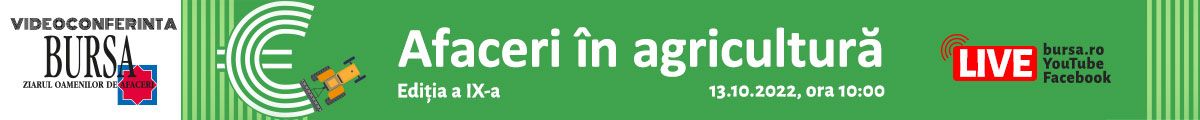 Ziarul BURSA a organizat a IX-a ediţie a videoconferinţei “Afaceri în agricultură”, în data de 13 octombrie 2022, începând cu ora 10:00.