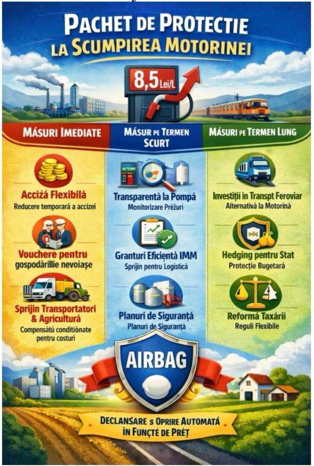 AEI propune dezvoltatrea unui mecanism de intervenţie a statului dacă preţul produselor petroliere creşte cu mai mult de 10% în 3 luni. Un pachet coerent (şi realist) de protecţie a populaţiei şi economiei, gândit ca un „airbag” temporar la scumpiri, fără să rupă bugetul şi fără să distorsioneze grav piaţa. Deoarece România nu se confruntă cu o criză de aprovizionare, ci cu o vulnerabilitate de preţ care riscă să alimenteze inflaţia şi să afecteze transportul, agricultura şi lanţurile de distribuţie, este nevoie de un pachet temporar şi ţintit de măsuri - de la un ”mecanism fiscal de flexibile” până la sprijinul direct pentru categoriile vulnerabile şi sectoarele strategice - care să atenueze şocul fără a distorsiona piaţa. Protejarea populaţiei şi a economiei nu înseamnă intervenţii brutale, ci decizii inteligente, calibrate şi limitate în timp.