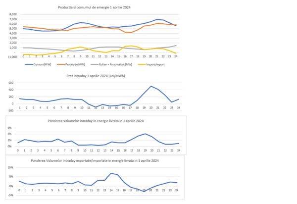 Analizând datele de consum / producţie de pe site-ul TRANSELECTRICA şi datele privind preţurile şi volumele tranzacţionate pe piaţa intraday de pe site-ul OPCOM, în ziua de 1 aprilie 2024 (una din zilele cu preţuri negative), constatăm că aceste preţuri negative au fost atinse exclsusiv între orele 11 - 17, când aceste surse au depăşit contractele de producţie şi import. Ponderea acestor surse a fost între 0,3 - 1% din energia consumată în România (adică mai mult decât neglijabile), fiind exportate în mare parte din lipsa cererii de energie în România la nivelul acelor ore.