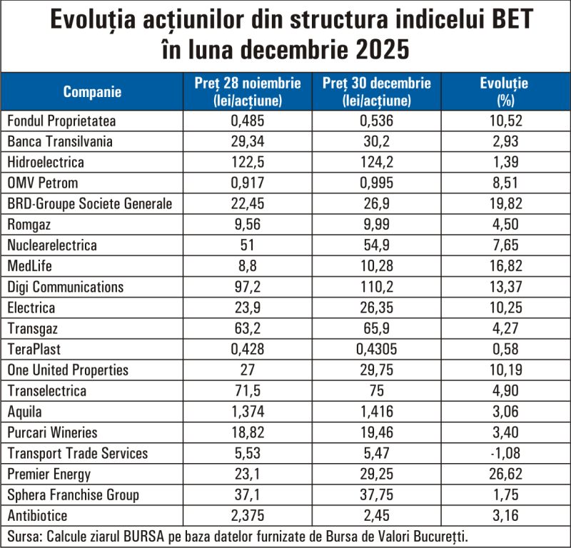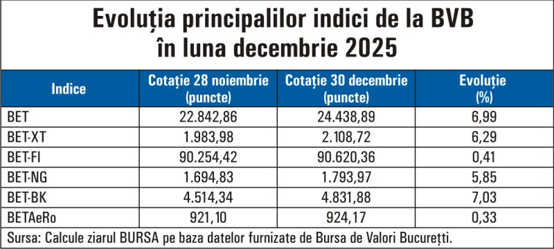 Indicii Bursei de Valori Bucureşti (BVB) au încheiat în creştere ultima lună din 2025, an marcat de aprecieri fulminante ale preţurilor acţiunilor din piaţa noastră, manifestate după alegerile prezidenţiale din luna mai, care au confirmat parcursul proeuropean al ţării. În plus, stabilitatea cursului valutar din a doua parte a anului şi reducerea treptată a dobânzilor la care se împrumută statul au sporit, probabil, încrederea în activele financiare româneşti, susţinând evoluţiile bursiere.