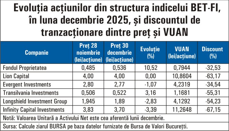 La finalul lunii decembrie, fostele SIF-uri se tranzacţionau la discounturi între preţul de piaţă şi Valoarea Unitară a Activului Net (VUAN), cuprinse între 67% în cazul Infinity Capital şi 34% pentru Evergent Investments. Pentru Fondul Proprietatea (FP), discountul era de 32%, peste obiectivul administratorului Franklin Templeton, care vizează un nivel sub 15%.