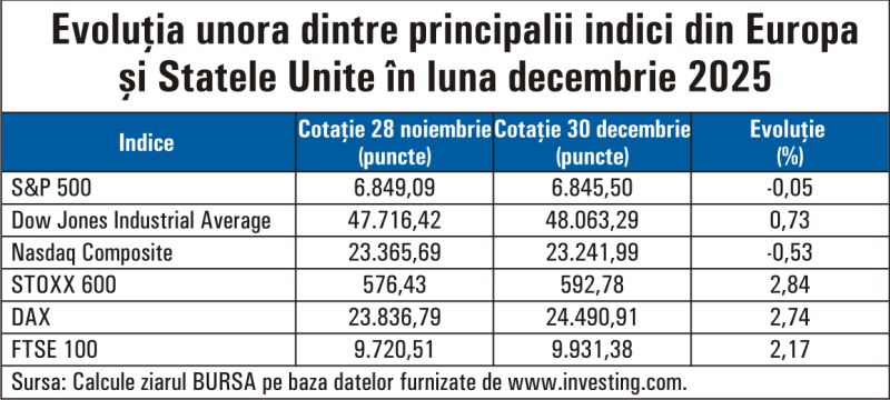 De partea noastră a Atlanticului, indicele pan-european Stoxx 600 s-a apreciat cu 2,84%, în vreme ce, la Frankfurt, indicele DAX a consemnat un avans de 2,74%, în ultima lună din 2025.