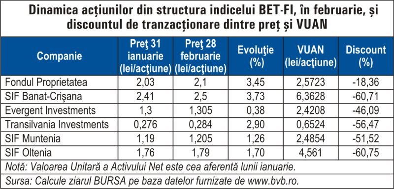 Indicele BET-FI, al SIF-urilor şi Fondul Proprietatea (FP), a avut un avans de 2,4%, în februarie, până la 50.946 de puncte, dinamică susţinută în primul rând de evoluţia titlurilor FP. Acţiunile fondului închis de investiţii, au urcat cu 3,4%, la 2,1 lei, într-o lună în care FP a derulat o ofertă publică de cumpărare pentru 3,61% din capital, la preţul unitar de 2,19 lei. De asemenea, preţul acţiunii fondului probabil este susţinut de apropierea vânzării unei părţi sau a întregului pachet deţinut la Hidroelectrica, companie care anul trecut a obţinut un profit net de patru miliarde de lei.