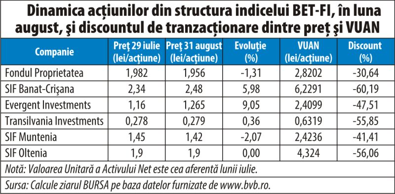 În ansamblu, indicele BET-FI, al SIF-urilor şi Fondului Proprietatea (FP), a urcat în august cu 1,78%, la 50.985 de puncte, fiind singurul coş de acţiuni al Pieţei Reglementate de la BVB care s-a apreciat, luna trecută, dar fără motive fundamentale evidente.