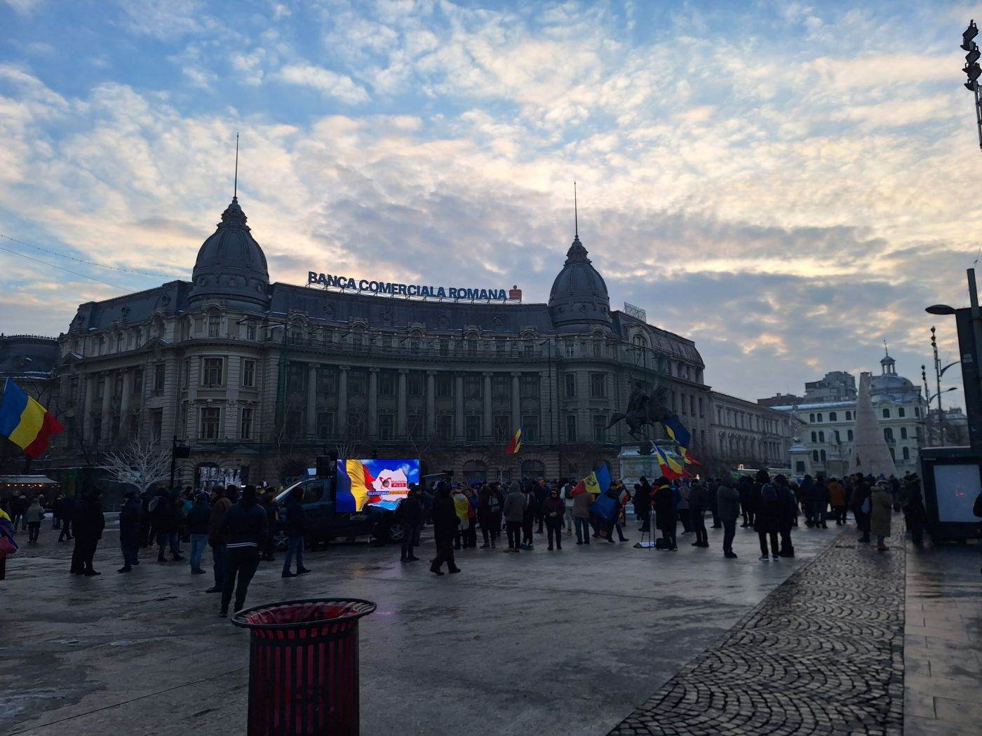 La ora 17:30, în Piaţa Universităţii sunt doar câteva zeci de persoane. Aceştia afişează steagul României, iar în esplanada ”Statui” a fost instalat un mic ecran.