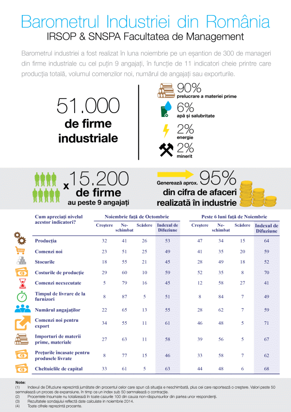 Dr. Petre Datculescu, directorul general al IRSOP Market Research & Consulting, a declarat: "Sectorul industrial din România este în contracţie uşoară, indicatori precum producţia, comenzile noi sau stocurile având o tendinţă descendentă în luna noiembrie. Industria este, însă, optimistă şi aşteaptă o creştere a principalilor indicatori de activitate în următoarele 6 luni".