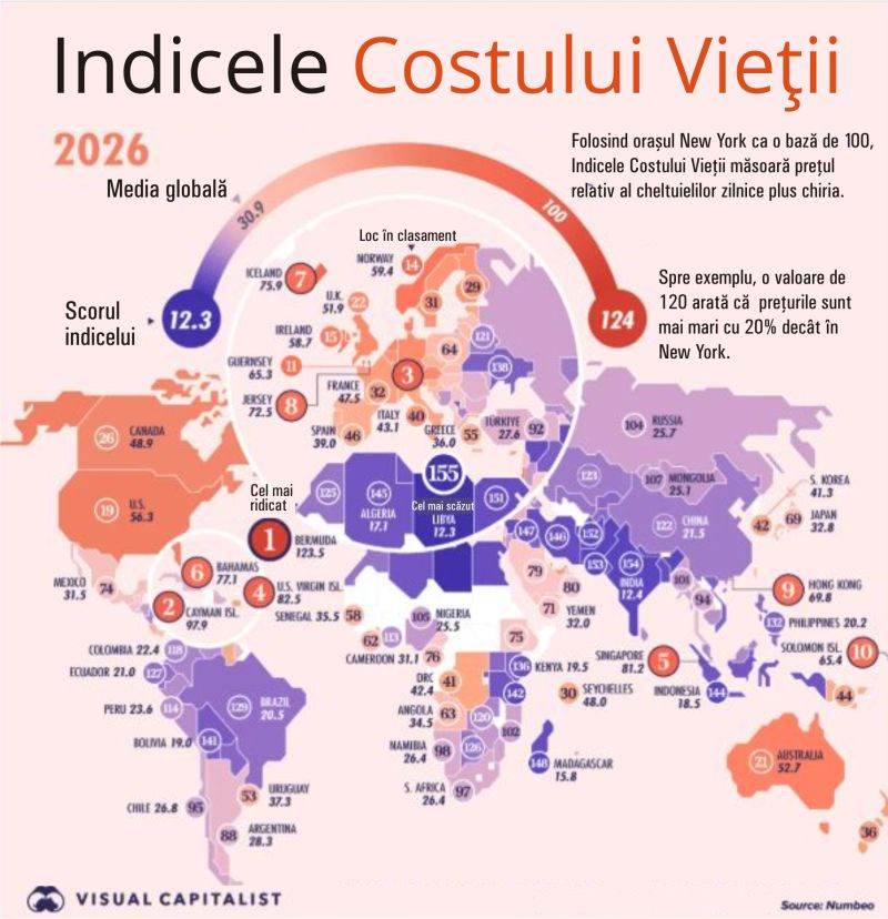 The US ranks 19th globally, with a cost of living index of 56.3. For comparison, the global average score for the index is 30.8 in 2026. Before the US, places 11-18 are occupied by: Guernsey (65.3), Luxembourg (65.2%), Gibraltar (63.9), Norway (59.4), Ireland (58.7), Israel (58), Netherlands (57.9), Denmark (56.6). After the US, in 20th place, we find the Isle of Man, with an index of 55.7.