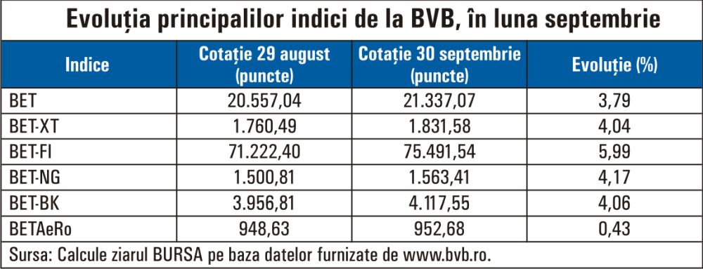 Indicii Bursei de Valori Bucureşti (BVB) au înregistrat, în septembrie, a cincea lună consecutivă de creştere, în ton cu aprecierile marilor pieţe internaţionale, influenţate de relaxarea politicii monetare de către Rezerva Federală. În acelaşi timp, agenţiile de rating au menţinut calificativul de ”recomandat investiţiilor” pentru ţara noastră, dar cu perspectivă negativă, ceea ce reflectă atât îmbunătăţirea perspectivelor economice, cât şi riscurile privind implementarea planului de consolidare fiscală al Guvernului.