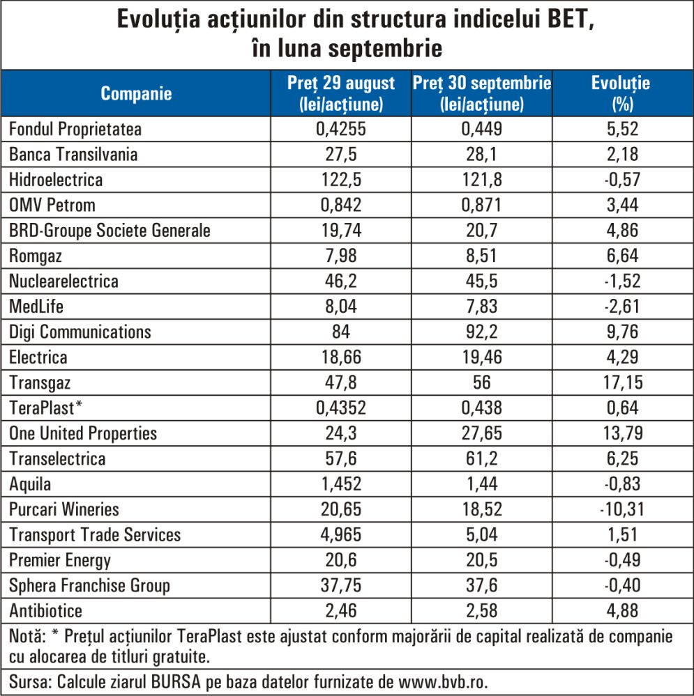 Principalele titluri listate la Bursa de Valori Bucureşti au înregistrat, în mare parte, creşteri moderate în luna septembrie, unele aprecieri mai semnificative fiind datorate anumitor evenimente corporative de impact.