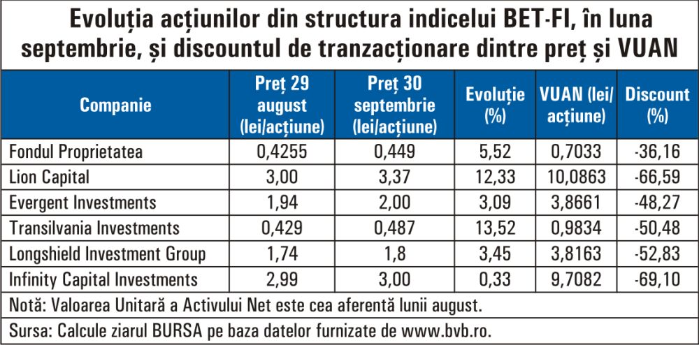 La finalul lunii septembrie, fostele SIF-uri se tranzacţionau la discounturi între preţul de piaţă şi Valoarea Unitară a Activului Net (VUAN), cuprinse între 69% pentru Infinity Capital şi 48% în cazul Evergent Investments. Pentru Fondul Proprietatea (FP), discountul era de 36%, peste obiectivul administratorului Franklin Templeton, care vizează un nivel sub 15%.