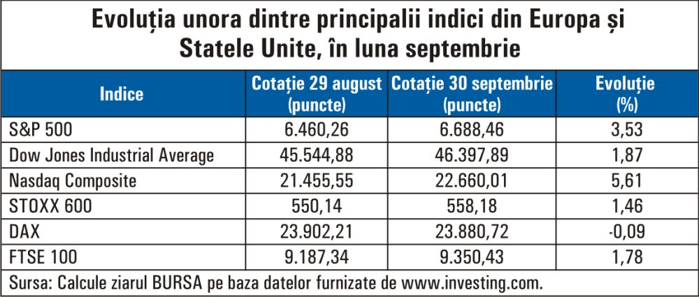 În acest context, indicele S&P 500 s-a apreciat cu 3,53% luna trecută, în timp ce Dow Jones Industrial Average a avut un avans de 1,87%. Indicele Nasdaq Composite, care reuneşte companiile ce activează în domenii intensive în cunoaştere - cele mai sensibile la mişcările de politică monetară - a urcat cu 5,61%, în luna septembrie.