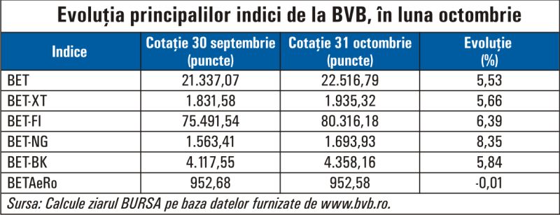 Indicii Bursei de Valori Bucureşti (BVB) au înregistrat, în septembrie, a şasea lună consecutivă de creştere consecutivă, pe fondul unui cumul de factori interni şi influenţe externe favorabile. Indicele BET, al celor mai lichide douăzeci de titluri ale pieţei noastre, a înregistrat un avans de 5,53%, până la 21.517 puncte, în vreme ce indicele BET-BK, reperul de randament al fondurilor de investiţii în acţiuni, a avut un avans de 5,84%, la 4.358 puncte.