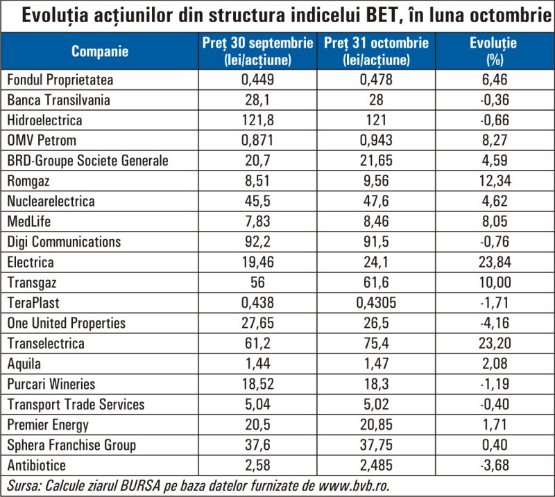 Titlurile producătorului de petrol şi gaze OMV Petrom s-au apreciat cu 8,27% luna trecută, perioadă în care acţionarii au aprobat alocarea de dividende suplimentare în valoare de aproape 1,25 miliarde lei, respectiv o alocare unitară de 0,02 lei, echivalentul unui randament de circa 2%. Compania a raportat venituri din vânzări de 9,8 miliarde lei pentru cel de-al treilea trimestru al anului, în vreme ce profitul net s-a ridicat la 1,34 miliarde lei, în creştere cu 4%.