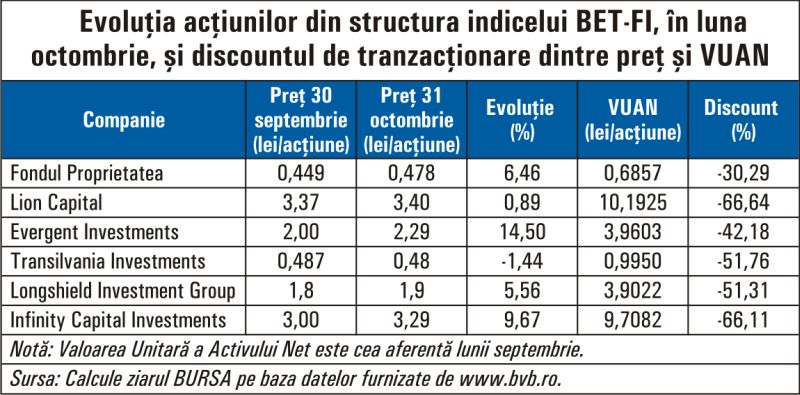 La finalul lunii octombrie, fostele SIF-uri se tranzacţionau la discounturi între preţul de piaţă şi Valoarea Unitară a Activului Net (VUAN), cuprinse între 66% pentru Lion Capital şi Infinity Capital, în vreme ce titlurile Evergent Investments se tranzacţionau la o diferenţă relativă între preţ şi activ net de 42%. Pentru Fondul Proprietatea, discountul era de 30%, peste obiectivul administratorului Franklin Templeton, care vizează un nivel sub 15%.