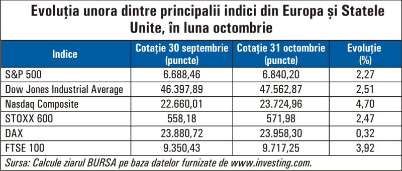 În acest context, indicele S&P 500 s-a apreciat cu 2,27% luna trecută, în timp ce Dow Jones Industrial Average a avut un avans de 2,51%. Indicele Nasdaq Composite, care reuneşte companiile ce activează în domenii intensive în cunoaştere - cele mai sensibile la mişcările de politică monetară - a urcat cu 4,7%, în luna octombrie.