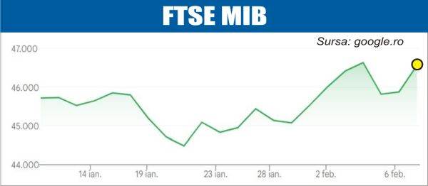 - Indicele FTSE MIB a crescut cu 1,3%, la 46.490,97 puncte la ora 15.17.