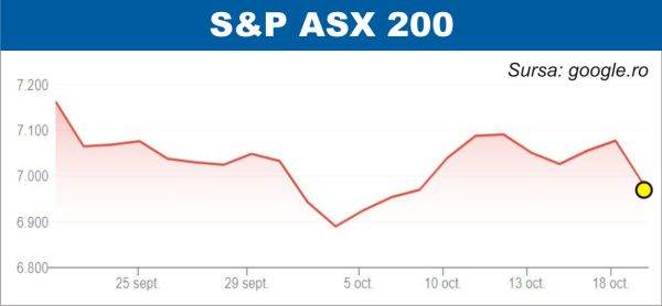 - Indicele S&P/ASX 200 a scăzut cu 1,4%, la 6.981,60 puncte.