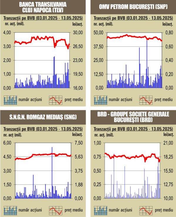 În piaţa "regular", topul valorii transferurilor a fost condus de acţiunile Banca Transilvania (TLV), ce au cumulat un rulaj de 13,5 milioane lei, titlurile instituţiei de credit încheind ziua în scădere cu 0,07%, la preţul de 26,8 lei.