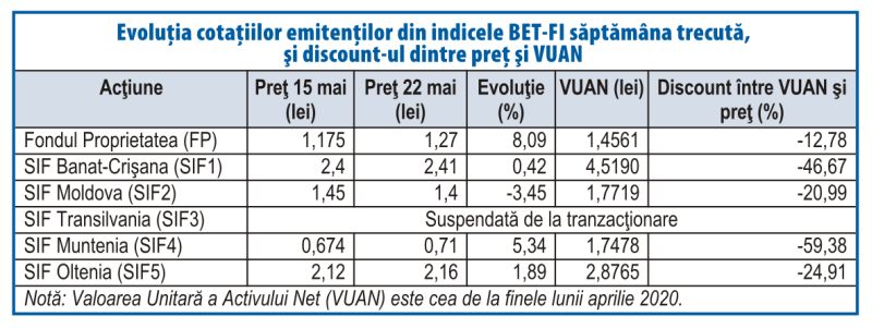 Sectorul fondurilor închise de investiţii a avut o evoluţie sub cea a pieţei în ansamblu, indicele BET-FI, al celor cinci SIF-uri plus Fondul Proprietatea (FP), marcând un avans de 2,24%, până la 43.129,04 puncte.