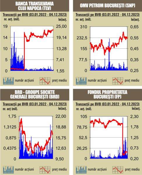 Pe poziţia a doua în topul rulajului s-au situat acţiunile Banca Transilvania (TLV), ce s-au apreciat cu 0,96%, până la preţul de 23,2 lei, în condiţiile unor schimburi de 7,8 milioane lei.
