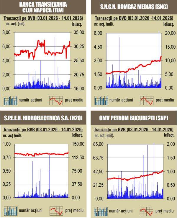 În piaţa ”regular”, topul valorii tranzacţiilor a fost condus de acţiunile Banca Transilvania (TLV), care au cumulat un rulaj de 13,6 milioane de lei, titlurile instituţiei de credit încheind ziua la preţul unitar de 32,6 lei, în creştere cu 0,93%.