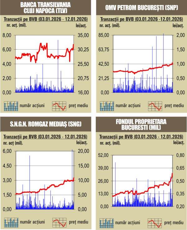 Pe poziţia a patra în clasamentul lichidităţii s-au situat titlurile Fondul Proprietatea (FP), care au cumulat un rulaj de 7,5 milioane de lei, acţiunile fondului închis de investiţii încheind ziua la preţul unitar de 0,588 lei, în creştere cu 4,07%. Franklin Templeton, administratorul FP, a anunţat ieri că este foarte probabil ca următoarea valoare a activului net care va fi raportată să fie cu cel puţin 5% mai mare decât cea raportată luna trecută, în principal datorită actualizării evaluării tuturor deţinerilor nelistate semnificative din portofoliul Fondului.