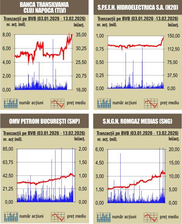 În piaţa „regular”, topul valorii tranzacţiilor a fost condus de acţiunile Banca Transilvania (TLV), care au cumulat un rulaj de 20,2 milioane de lei, titlurile instituţiei de credit încheind ziua la preţul unitar de 34,1 lei, în scădere cu 2,57%.