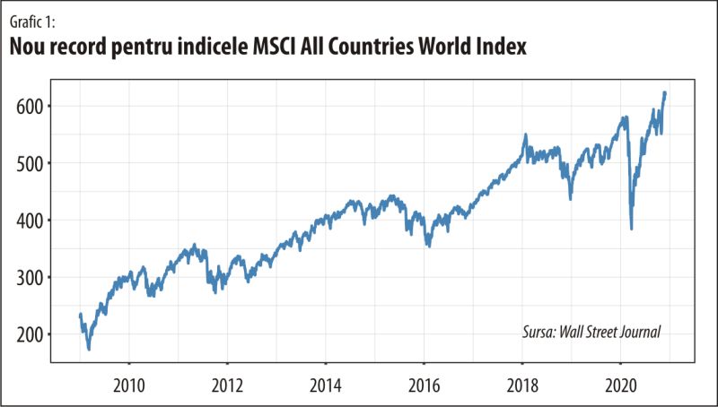 Bloomberg a subliniat că indicele MSCI All Countries World a înregistrat o creştere record în noiembrie 2020, de peste 12%, şi a încheiat luna foarte aproape de noua valoare maximă, de 623,8 puncte, atinsă în ultima zi de tranzacţionare a săptămânii trecute (vezi graficul 1).