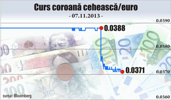 Astfel, cursul euro/czk a urcat, în doar patru minute, cu 3,2%, de la 25,79 czk/euro la 26,62 czk/euro, potrivit datelor furnizate de agenţia de ştiri. După o uşoară depreciere, timp de şapte minute, până la 26,5 czk/euro, şi-ar reluat tendinţa ascendentă, atingând un maxim al zilei de 26,97 czk/euro, în jurul orei 15:00.