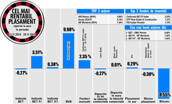 Randamentele plasamentelor analizate la această rubrică sunt raportate la moneda europeană. Randamentele calculate sunt cele mai bune pe fiecare categorie de plasament, fără a fi luată în calcul lichiditatea tranzacţiilor. Indicii Bursei de Valori Bucureşti sunt calculaţi pe baza cotaţiilor de închidere, în timp ce în cazul acţiunilor, în calcul este folosit preţul mediu. Piaţa AeRO nu este avută în vedere. Valorile unitare ale fondurilor mutuale utilizate în analiză sunt cele aferente perioadei precizate în grafic. Articolul nu reprezintă o sugestie de investiţii.