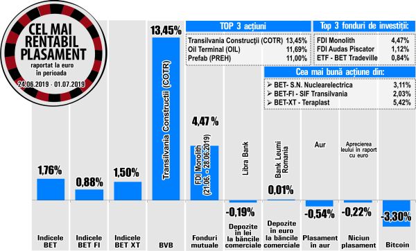 Randamentele plasamentelor analizate la această rubrică sunt raportate la moneda europeană. Randamentele calculate sunt cele mai bune pe fiecare categorie de plasament, fără a fi luată în calcul lichiditatea tranzacţiilor. Indicii Bursei de Valori Bucureşti sunt calculaţi pe baza cotaţiilor de închidere, în timp ce în cazul acţiunilor, în calcul este folosit preţul mediu. Piaţa AeRO nu este avută în vedere. Valorile unitare ale fondurilor mutuale utilizate în analiză sunt cele aferente perioadei precizate în grafic. Articolul nu reprezintă o sugestie de investiţii.