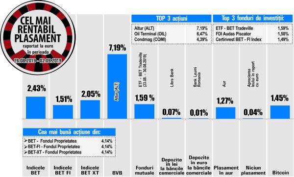 Randamentele plasamentelor analizate la această rubrică sunt raportate la moneda europeană. Randamentele calculate sunt cele mai bune pe fiecare categorie de plasament, fără a fi luată în calcul lichiditatea tranzacţiilor. Indicii Bursei de Valori Bucureşti sunt calculaţi pe baza cotaţiilor de închidere, în timp ce în cazul acţiunilor, în calcul este folosit preţul mediu. Piaţa AeRO nu este avută în vedere. Valorile unitare ale fondurilor mutuale utilizate în analiză sunt cele aferente perioadei precizate în grafic. Articolul nu reprezintă o sugestie de investiţii.
