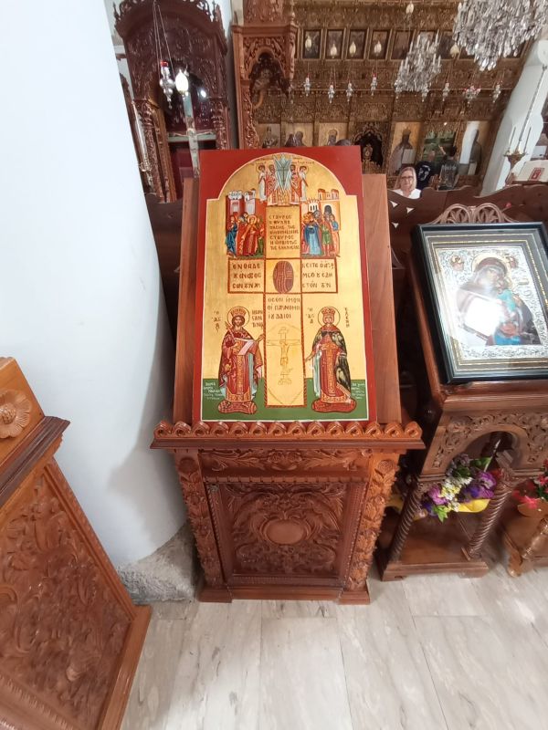O trăsătură distinctivă a Bisericii este catapeteasma sculptată în lemn, construită în anul 1760, ce conţine o nişă în care se păstrează o cruce mare, de argint aurit, în care s-ar afla o parte din lemnul Sfintei Cruci pe care a fost răstignit Iisus Hristos. Crucea este acoperită în întregime cu foiţe subţiri de argint. În partea din faţă a Crucii pot fi văzute paisprezece reprezentări în relief din viaţa Domnului, cu îngeri şi sfinţii Constantin şi Elena. Reprezentarea Răstignirii domină în centru şi este acoperită de două uşi laterale, care reprezintă Theotokos (Maica Domnului) şi Ioannis (Ioan). Această reprezentare este înconjurată de patru îngeri. Constantin cel Mare, "Răstignirea lui Iisus", "Golgota" şi Sfânta Elena sunt reprezentate într-un rând orizontal pe Cruce. "Tronul celei de-a Doua Veniri" şi "Învierea lui Iisus", precum şi "Îngroparea" lui Hristos sunt reprezentate într-un rând vertical pe Cruce, de sus în jos.