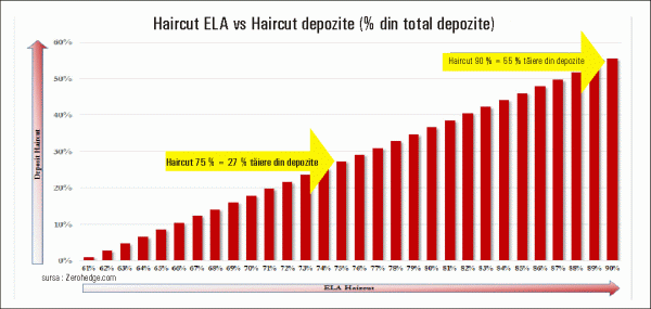 În acest moment, este necesară o tăiere a depozitelor, arată site-ul de analiză financiară. Potrivit zerohedge, o tăiere de 75% a garanţiilor implică un bail-in de 33 miliarde euro (37%), în timp ce creşterea haircut-ului la 90% implică o lovitură de 67 miliarde euro (55% în depozite). Acest scenariu din urmă seamănă izbitor cu ceea ce s-a întâmplat în Cipru şi nu este atât de surprinzător întrucât, dacă aşa cum a zis Jeroen Dijsselbloem, preşedintele Eurogrupului, Cipru este un model (template), atunci următorul pas după controlul de capital este bail-in-ul", potrivit sursei citate.