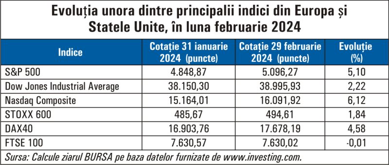 În Statele Unite indicii au bifat noi recorduri istorice, creşterile fiind alimentate, în esenţă, de rezultatele publicate de companii şi de entuziasmul din jurul inteligenţei artificiale. Indicele S&P 500 a urcat cu 5,1%, în februarie, a patra lună consecutivă de creştere, în vreme ce Dow Jones s-a apreciat cu 2,2%. Nasdaq Composite, al companiilor din sectoare ce activează în domenii intensive în cunoaştere, a crescut cu 6,1%.