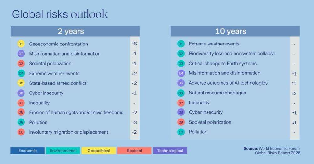 Conform sursei citate, deşi confruntarea geoeconomică, conflictele armate între state, fenomenele meteo extreme, polarizarea societăţii, precum şi dezinformarea şi informarea eronată au fost identificate de respondenţi drept cele mai importante cinci riscuri imediate pentru anul 2026, dezinformarea şi informarea eronată, respectiv polarizarea societăţii, au urcat pe locurile al doilea şi al treilea în perspectiva pe următorii doi ani.