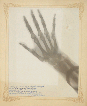 Radiografia mâinii drepte a Reginei Elisabeta este realizată cu primul aparat Roentgen din ţara noastră, în 1896, la Şcoala de Poduri şi Şosele din Bucureşti de către Ioan D. Ghica. Gestul Reginei nu era doar o necesitate, ci avea rolul de a insufla încredere românilor în noua tehnologie medicală bazată pe folosirea razelor X, descoperită de profesorul german Wilhelm Roentgen cu doar un an înainte, în 1895.