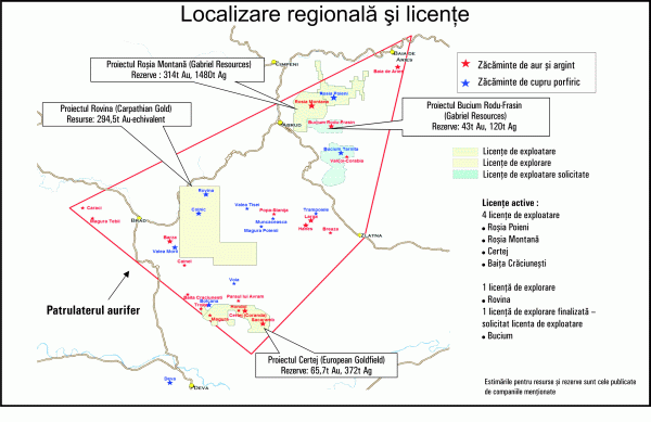 De asemenea, la aceeaşi dată figurează ca emise licenţe de exploatare pentru "produs rezidual minier" pentru Romaltyn Mining SRL, la Uzina de preparare Aurul SA Baia Mare, Iaz de decantare - Aurul Săsar, Iaz de decantare-Meda şi Iaz de decantare - Flotaţia centrală.