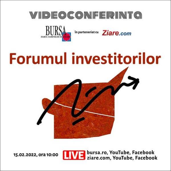 Grupul de presă BURSA, în parteneriat cu Ziare.com, organizează videoconferinţa "Forumul investitorilor", în data de 15 februarie 2022, începând cu ora 10:00.