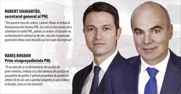 Robert Sighiartău, secretarul general al PNL, a declarat, ieri, că Ludovic Orban ar trebui să demisioneze din fruntea formaţiunii politice liberale. El l-a acuzat că în ultimul an ar fi condus partidul discreţionar şi că a cedat ministere importante în negocierile cu USRPLUS pentru a obţine pentru sine funcţia de preşedinte al Camerei Deputaţilor. Secretarul General al PNL mai spune că Orban ar fi dorit să-l retragă din nou pe Florin Cîţu drept propunere pentru funcţia de premier.