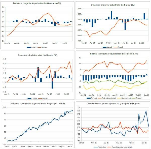 Preţurile importurilor din Germania şi-au accelerat scăderea anuală în decembrie 2025, până la 2,3%, de la 1,9% în luna precedentă, pe fondul unei scăderi lunare de 0,1%, după o creştere de 0,5% în luna anterioară. Preţurile energiei importate au scăzut cu o rată anuală de 20,6%, în condiţiile unei scăderi lunare de 4,6%, pe fondul unei scăderi anuale de 23,4% a preţului gazelor naturale şi a unei scăderi de 14% a preţului electricităţii. Preţurile importurilor, exclusiv energia, au scăzut cu o rată anuală de 0,3%, în condiţiile unei creşteri lunare de 0,3%. (Destatis)