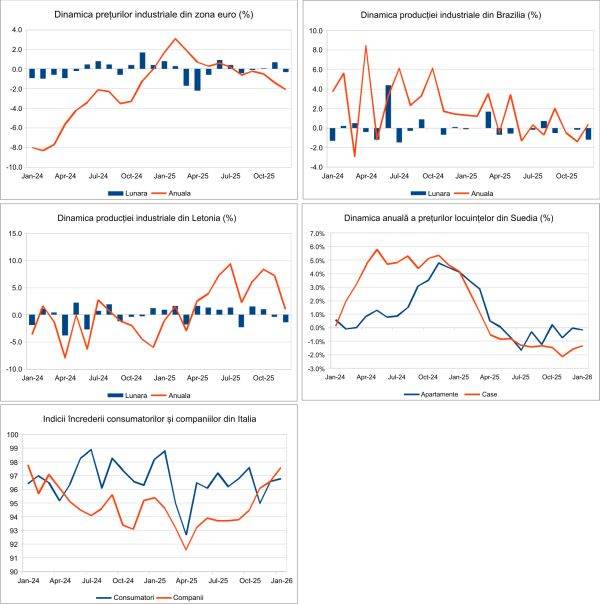 Preţurile producătorilor industriali din zona euro au scăzut cu o rată anuală de 2,1% în decembrie 2025, după o scădere de 1,4% în luna precedentă, pe fondul unei scăderi lunare de 0,3%, după un avans de 0,7% în luna anterioară. Preţurile industriale din UE au scăzut cu o rată anuală de 1,9%, după o scădere de 1,1% în luna precedentă, în condiţiile unei scăderi lunare de 0,4%. Cele mai mari scăderi anuale s-au înregistrat în Luxemburg (-5,6%), Irlanda (-4,9%) şi Portugalia (-3,7%), iar cele mai mari creşteri au fost observate în Bulgaria (+9,8%), România (+6,6%) şi Suedia (+1,3%). (Eurostat)