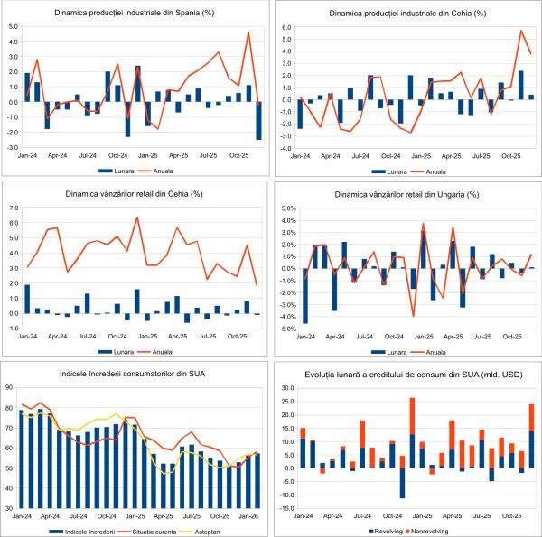 Creditul de consum din SUA a crescut peste aşteptări în decembrie 2025, cu 24 de miliarde de dolari, după o creştere de 4,7 miliarde în luna precedentă. Creditul revolving, care include creditul acordat pe carduri, a crescut cu 13,8 miliarde, după o scădere de 1,7 miliarde în luna precedentă, iar creditul nonrevolving, în principal pentru studii şi auto, a crescut cu 10,2 miliarde, după un avans de 6,6 miliarde de dolari în luna anterioară. (Federal Reserve)